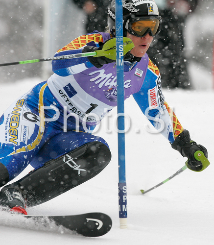 : Fourth placed after first run Anja Paerson of Sweden skiing in first run of Women slalom race of Ofterschwang Audi FIS Ski World Cup 2008-09. Slalom race of Women Audi FIS Ski World Cup 2008-09 was held in Ofterschwang, Germany, on Saturday, 7th of March 2009.