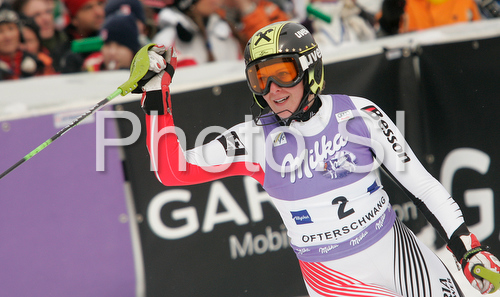 : Third placed Nicole Hosp of Austria reacts in finish of second run of Women slalom race of Ofterschwang Audi FIS Ski World Cup 2008-09. Slalom race of Women Audi FIS Ski World Cup 2008-09 was held in Ofterschwang, Germany, on Saturday, 7th of March 2009.