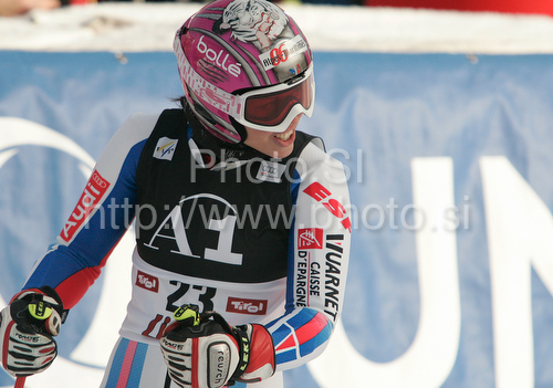 : Marion Bertrand of France reacts in finish of second run of women giant slalom World Cup race in Lienz, Austra. Giant slalom race of Women Audi FIS Alpine skiing World Cup 2009-10 was held in Lienz, Slovenia, on 28th of December 2009.