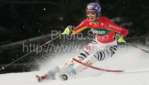 : Seventh after first run Maria Riesch of Germany skiing in first run of women slalom World Cup race in Lienz, Austra. Slalom race of Women Audi FIS Alpine skiing World Cup 2009-10 was held in Lienz, Austria, on 29th of December 2009.