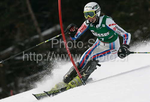 : Fourth after first run Sandrine Aubert of France skiing in first run of women slalom World Cup race in Lienz, Austra. Slalom race of Women Audi FIS Alpine skiing World Cup 2009-10 was held in Lienz, Austria, on 29th of December 2009.