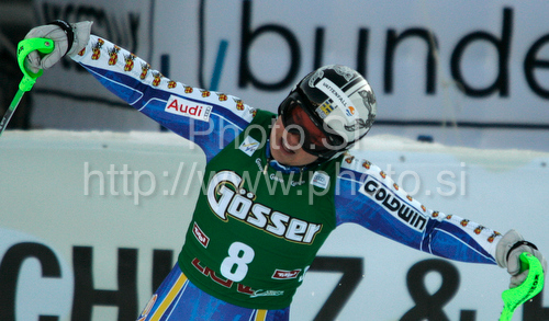 : Anja Paerson of Sweden reacts in finish of second run of women slalom World Cup race in Lienz, Austra. Slalom race of Women Audi FIS Alpine skiing World Cup 2009-10 was held in Lienz, Austria, on 29th of December 2009.
