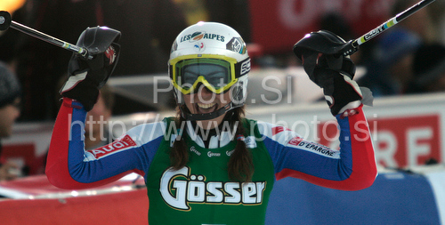 Lienz ,Austria - 29.12.2009 : Second placed Sandrine Aubert of France reacts in finish of second run of women slalom World Cup race in Lienz, Austra. Slalom race of Women Audi FIS Alpine skiing World Cup 2009-10 was held in Lienz, Austria, on 29th of December 2009. Photo by: Primoz Jeroncic