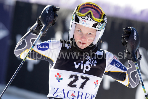 : Sanni Leinonen of Finland reacts in finish of second run of women Snow queen trophy slalom World Cup race in Zagreb, Croatia. Slalom race of Women Audi FIS Alpine skiing World Cup 2009-10 was held in on Sljeme above Zagreb, Croatia, on 3rd of January 2010.