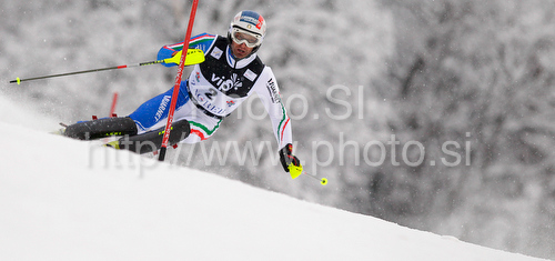 : Third after first run Manfred Moelgg of Italy skiing in first run of men Snow queen trophy slalom World Cup race in Zagreb, Croatia. Slalom race of Men Audi FIS Alpine skiing World Cup 2009-10 was held on Sljeme above Zagreb, Croatia, on 6th of January 2010.
