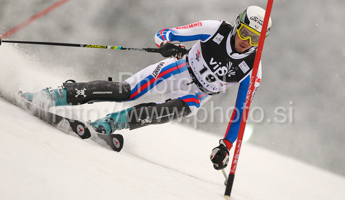 : Sixth after first run Steve Missillier of France skiing in first run of men Snow queen trophy slalom World Cup race in Zagreb, Croatia. Slalom race of Men Audi FIS Alpine skiing World Cup 2009-10 was held on Sljeme above Zagreb, Croatia, on 6th of January 2010.