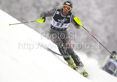: Tenth after first run Urs Imboden of Moldova skiing in first run of men Snow queen trophy slalom World Cup race in Zagreb, Croatia. Slalom race of Men Audi FIS Alpine skiing World Cup 2009-10 was held on Sljeme above Zagreb, Croatia, on 6th of January 2010.