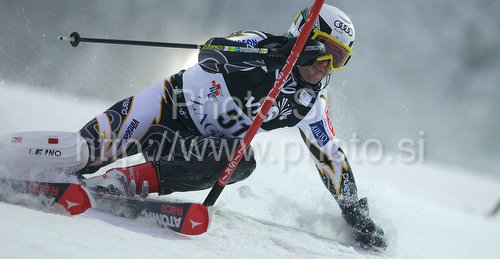 : Jukka Leino of Finland skiing in first run of men Snow queen trophy slalom World Cup race in Zagreb, Croatia. Slalom race of Men Audi FIS Alpine skiing World Cup 2009-10 was held on Sljeme above Zagreb, Croatia, on 6th of January 2010.