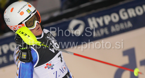 : Mattias Hargin of Sweden reacts in finish of second run of men Snow queen trophy slalom World Cup race in Zagreb, Croatia. Slalom race of Men Audi FIS Alpine skiing World Cup 2009-10 was held on Sljeme above Zagreb, Croatia, on 6th of January 2010.