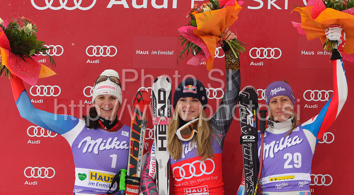 : Winner Lindsey Vonn of USA (M), second placed Nadja Kamer of Switzerland (L) and third placed Ingrid Jacquemod of France (R) celebrates their medals won in women downhill race of Audi FIS alpine skiing World Cup in Haus im Ennstal, Austria. Downhill race of Women Audi FIS Alpine skiing World Cup 2009-10 was held in Haus im Ennstal, Austria, on 9th of January 2010.