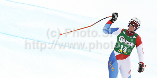 : Andrea Dettling of Switzerland reacts in finish of women Super-G race of Audi FIS alpine skiing World Cup in Haus im Ennstal, Austria. Super-G race of Women Audi FIS Alpine skiing World Cup 2009-10 was held in Haus im Ennstal, Austria, on 10th of January 2010.