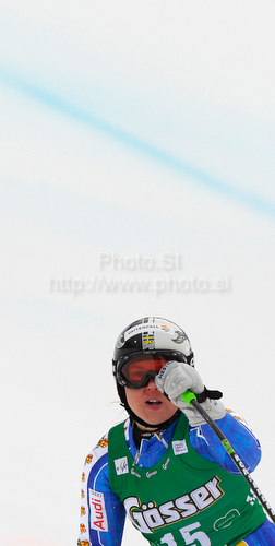 : Second placed Anja Paerson of Sweden reacts in finish of women Super-G race of Audi FIS alpine skiing World Cup in Haus im Ennstal, Austria. Super-G race of Women Audi FIS Alpine skiing World Cup 2009-10 was held in Haus im Ennstal, Austria, on 10th of January 2010.