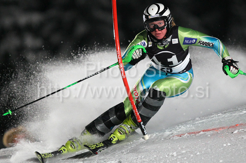: Marusa Ferk of Slovenia skiing in first run of Women slalom race of Audi FIS alpine skiing World Cup in Flachau, Austria. Slalom race of Women Audi FIS Alpine skiing World Cup 2009-10 was held in Flachau, Austria, on 12th of January 2010.