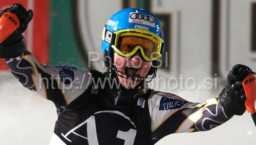 : Fourth placed Tanja Poutiainen of Finland reacts in finish of second run of Women slalom race of Audi FIS alpine skiing World Cup in Flachau, Austria. Slalom race of Women Audi FIS Alpine skiing World Cup 2009-10 was held in Flachau, Austria, on 12th of January 2010.