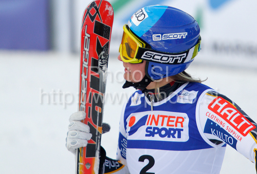 : Tanja Poutiainen of Finland reacts in finish of second run of Women giant slalom race of Audi FIS alpine skiing World Cup in Maribor, Slovenia. Giant slalom race of Women Audi FIS Alpine skiing World Cup 2009-10 was held in Maribor, Slovenia, on 16th of January 2010.