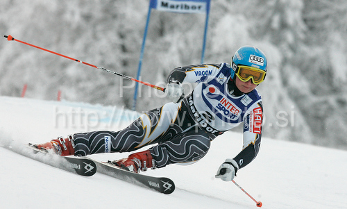 : Tanja Poutiainen of Finland skiing in second run of Women giant slalom race of Audi FIS alpine skiing World Cup in Maribor, Slovenia. Giant slalom race of Women Audi FIS Alpine skiing World Cup 2009-10 was held in Maribor, Slovenia, on 16th of January 2010.