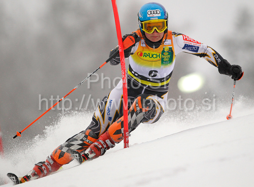 : Seventh placed after first run Tanja Poutiainen of Finland skiing in first run of Women slalom race of Audi FIS alpine skiing World Cup in Maribor, Slovenia. Slalom race of Women Audi FIS Alpine skiing World Cup 2009-10 was held in Maribor, Slovenia, on 17th of January 2010.