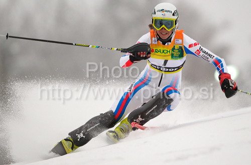 : Fourth after first run Sandrine Aubert of France skiing in first run of Women slalom race of Audi FIS alpine skiing World Cup in Maribor, Slovenia. Slalom race of Women Audi FIS Alpine skiing World Cup 2009-10 was held in Maribor, Slovenia, on 17th of January 2010.