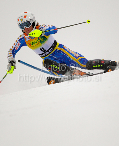 : Fourth after first run Maria Pietilae-Holmner of Sweden skiing in first run of Women slalom race of Audi FIS alpine skiing World Cup in Maribor, Slovenia. Slalom race of Women Audi FIS Alpine skiing World Cup 2009-10 was held in Maribor, Slovenia, on 17th of January 2010.
