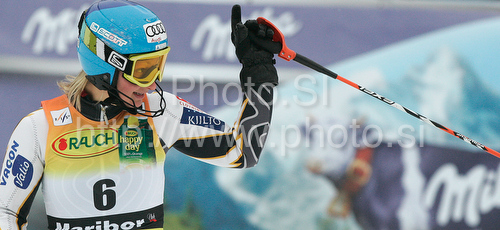 Maribor ,Slovenia - 17.01.2010 : Tanja Poutiainen of Finland reacts in finish of first run of Women slalom race of Audi FIS alpine skiing World Cup in Maribor, Slovenia. Slalom race of Women Audi FIS Alpine skiing World Cup 2009-10 was held in Maribor, Slovenia, on 17th of January 2010. Photo by: Leena Jeroncic