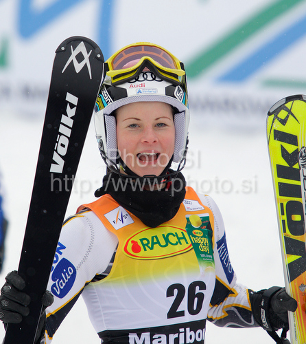 : Seventh placed Sanni Leinonen of Finland reacts in finish of second run of Women slalom race of Audi FIS alpine skiing World Cup in Maribor, Slovenia. Slalom race of Women Audi FIS Alpine skiing World Cup 2009-10 was held in Maribor, Slovenia, on 17th of January 2010.