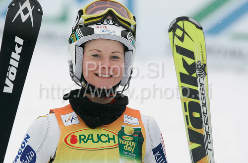 : Seventh placed Sanni Leinonen of Finland reacts in finish of second run of Women slalom race of Audi FIS alpine skiing World Cup in Maribor, Slovenia. Slalom race of Women Audi FIS Alpine skiing World Cup 2009-10 was held in Maribor, Slovenia, on 17th of January 2010.