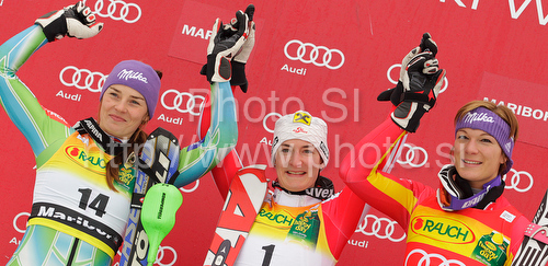 : Winner Kathrin Zettel of Austria (M), second placed Tina Maze of Slovenia (L) and third placed Maria Riesch of Germany (R) celebrate their medals won in Women slalom race of Audi FIS alpine skiing World Cup in Maribor, Slovenia. Slalom race of Women Audi FIS Alpine skiing World Cup 2009-10 was held in Maribor, Slovenia, on 17th of January 2010.
