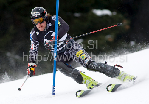 : Will Brandenburg (USA) attacks a control gate while competing in the mens Hahnenkamm slalom race part of the 70th Hahnenkamm Rennen race weekend, which is a fixture on the 2009/10 Audi FIS Alpine Skiing World Cup. Slalom race of men Audi FIS Alpine skiing World cup was held in Kitzbuhel, Austria, on 24th of January 2010.