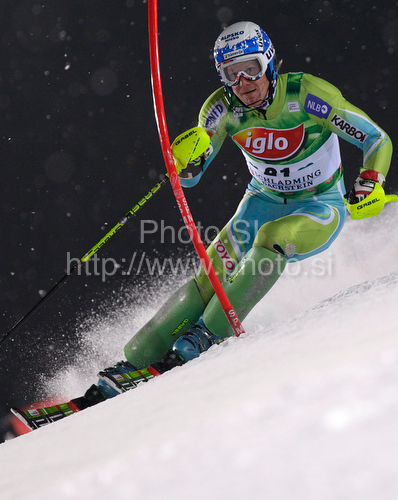 : Bernard Vajdic of Slovenia skiing in first run of Men Night slalom race of Audi FIS alpine skiing World Cup in Schladming, Austria. Slalom race of Men Audi FIS Alpine skiing World Cup 2009-10 was held in Schladming, Austria, on 26th of January 2010.