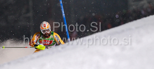 : Sixth after first run Julien Cousineau of Canada skiing in first run of Men Night slalom race of Audi FIS alpine skiing World Cup in Schladming, Austria. Slalom race of Men Audi FIS Alpine skiing World Cup 2009-10 was held in Schladming, Austria, on 26th of January 2010.