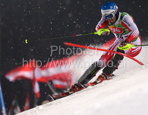 Schladming ,Austria - 26.01.2010 : Tenth after first run Wolfgang Hoerl of Austria skiing in first run of Men Night slalom race of Audi FIS alpine skiing World Cup in Schladming, Austria. Slalom race of Men Audi FIS Alpine skiing World Cup 2009-10 was held in Schladming, Austria, on 26th of January 2010. Photo by: Primoz Jeroncic