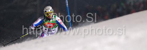 : Thomas Mermillod Blondin of France skiing in first run of Men Night slalom race of Audi FIS alpine skiing World Cup in Schladming, Austria. Slalom race of Men Audi FIS Alpine skiing World Cup 2009-10 was held in Schladming, Austria, on 26th of January 2010.