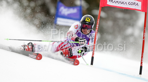 : Third after first run Marcel Hirscher of Austria skiing in first run of Men giant slalom race of Audi FIS alpine skiing World Cup in Kranjska Gora, Slovenia. Giant slalom race of Men Audi FIS Alpine skiing World Cup 2009-10, which substituted canceled giant slalom race from Adelboden, Switzerland, was held on Friday in Kranjska Gora, Slovenia, on 29th of January 2010.
