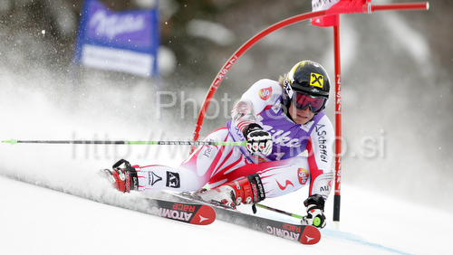 : Third after first run Marcel Hirscher of Austria skiing in first run of Men giant slalom race of Audi FIS alpine skiing World Cup in Kranjska Gora, Slovenia. Giant slalom race of Men Audi FIS Alpine skiing World Cup 2009-10, which substituted canceled giant slalom race from Adelboden, Switzerland, was held on Friday in Kranjska Gora, Slovenia, on 29th of January 2010.