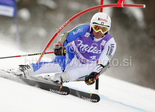: Seventh after first run Massimiliano Blardone of Italy skiing in first run of Men giant slalom race of Audi FIS alpine skiing World Cup in Kranjska Gora, Slovenia. Giant slalom race of Men Audi FIS Alpine skiing World Cup 2009-10, which substituted canceled giant slalom race from Adelboden, Switzerland, was held on Friday in Kranjska Gora, Slovenia, on 29th of January 2010.