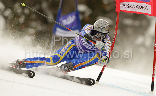 : Markus Larsson of Sweden skiing in first run of Men giant slalom race of Audi FIS alpine skiing World Cup in Kranjska Gora, Slovenia. Giant slalom race of Men Audi FIS Alpine skiing World Cup 2009-10, which substituted canceled giant slalom race from Adelboden, Switzerland, was held on Friday in Kranjska Gora, Slovenia, on 29th of January 2010.