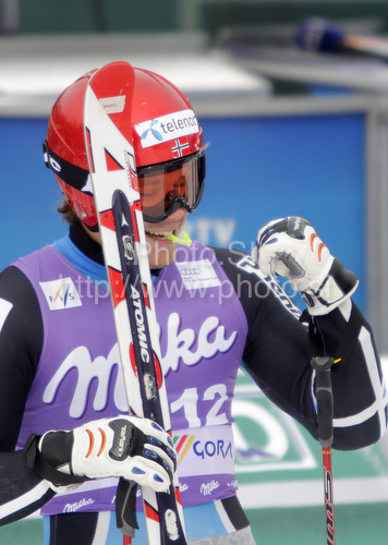 : Third placed Kjetil Jansrud of Norway reacts in finish of second run of Men giant slalom race of Audi FIS alpine skiing World Cup in Kranjska Gora, Slovenia. Giant slalom race of Men Audi FIS Alpine skiing World Cup 2009-10, which substituted canceled giant slalom race from Adelboden, Switzerland, was held on Friday in Kranjska Gora, Slovenia, on 29th of January 2010.
