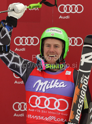 : Winner Ted Ligety of USA celebrates his medal won in Men giant slalom race of Audi FIS alpine skiing World Cup in Kranjska Gora, Slovenia. Giant slalom race of Men Audi FIS Alpine skiing World Cup 2009-10, which substituted canceled giant slalom race from Adelboden, Switzerland, was held on Friday in Kranjska Gora, Slovenia, on 29th of January 2010.