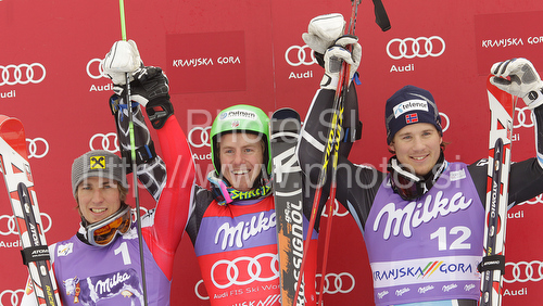 : Winner Ted Ligety of USA (M), second placed Marcel Hirscher of Austria (L) and third placed Kjetil Jansrud of Norway (R) celebrate their medals won in Men giant slalom race of Audi FIS alpine skiing World Cup in Kranjska Gora, Slovenia. Giant slalom race of Men Audi FIS Alpine skiing World Cup 2009-10, which substituted canceled giant slalom race from Adelboden, Switzerland, was held on Friday in Kranjska Gora, Slovenia, on 29th of January 2010.