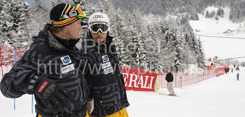 : Andreas Romar of Finland (R) during inspection of first run of second Men giant slalom race of Audi FIS alpine skiing World Cup in Kranjska Gora, Slovenia. Second giant slalom race of Men Audi FIS Alpine skiing World Cup 2009-10, was held on Saturday in Kranjska Gora, Slovenia, on 30th of January 2010.