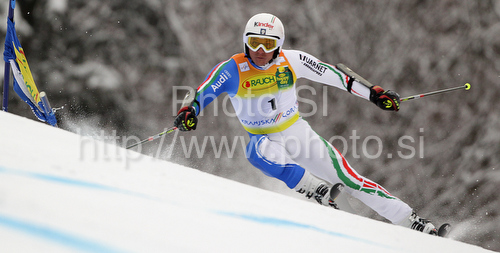 : Second placed after first run Massimiliano Blardone of Italy skiing in first run of second Men giant slalom race of Audi FIS alpine skiing World Cup in Kranjska Gora, Slovenia. Second giant slalom race of Men Audi FIS Alpine skiing World Cup 2009-10, was held on Saturday in Kranjska Gora, Slovenia, on 30th of January 2010.