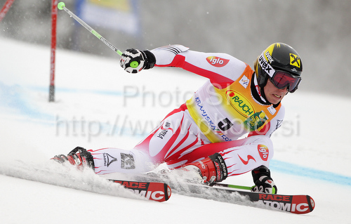 : Fifth after first run Marcel Hirscher of Austria skiing in first run of second Men giant slalom race of Audi FIS alpine skiing World Cup in Kranjska Gora, Slovenia. Second giant slalom race of Men Audi FIS Alpine skiing World Cup 2009-10, was held on Saturday in Kranjska Gora, Slovenia, on 30th of January 2010.