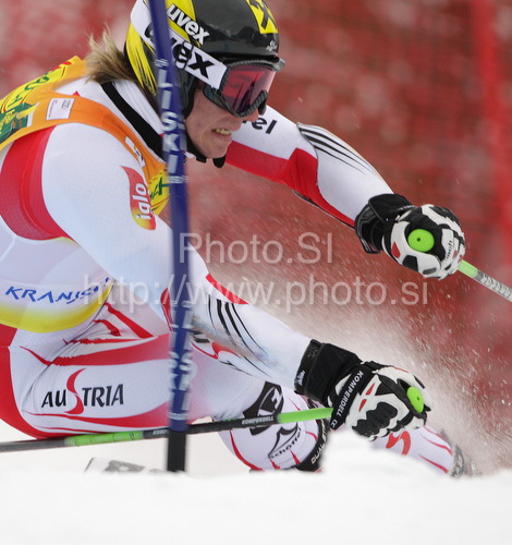 : Fifth after first run Marcel Hirscher of Austria skiing in first run of second Men giant slalom race of Audi FIS alpine skiing World Cup in Kranjska Gora, Slovenia. Second giant slalom race of Men Audi FIS Alpine skiing World Cup 2009-10, was held on Saturday in Kranjska Gora, Slovenia, on 30th of January 2010.