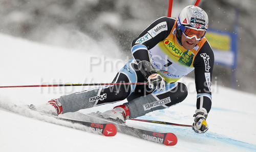 : Ninth placed after first run Aksel Lund Svindal of Norway skiing in first run of second Men giant slalom race of Audi FIS alpine skiing World Cup in Kranjska Gora, Slovenia. Second giant slalom race of Men Audi FIS Alpine skiing World Cup 2009-10, was held on Saturday in Kranjska Gora, Slovenia, on 30th of January 2010.