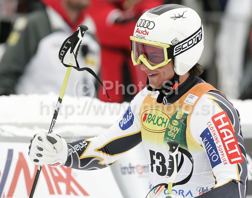 : Marcus Sandell of Fnland reacts in finish of second run of second Men giant slalom race of Audi FIS alpine skiing World Cup in Kranjska Gora, Slovenia. Second giant slalom race of Men Audi FIS Alpine skiing World Cup 2009-10, was held on Saturday in Kranjska Gora, Slovenia, on 30th of January 2010.
