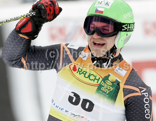 : Krystof Kryzl of Czech reacts in finish of second run of second Men giant slalom race of Audi FIS alpine skiing World Cup in Kranjska Gora, Slovenia. Second giant slalom race of Men Audi FIS Alpine skiing World Cup 2009-10, was held on Saturday in Kranjska Gora, Slovenia, on 30th of January 2010.