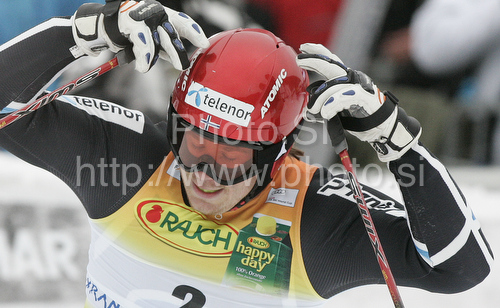 : Second placed Kjetil Jansrud of Norway reacts in finish of second run of second Men giant slalom race of Audi FIS alpine skiing World Cup in Kranjska Gora, Slovenia. Second giant slalom race of Men Audi FIS Alpine skiing World Cup 2009-10, was held on Saturday in Kranjska Gora, Slovenia, on 30th of January 2010.