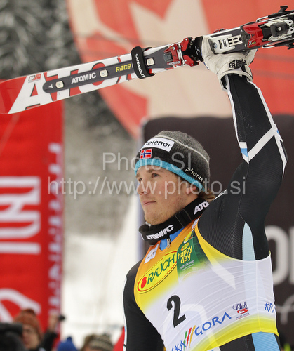 : Second placed Kjetil Jansrud of Norway celebrates his medal won in second Men giant slalom race of Audi FIS alpine skiing World Cup in Kranjska Gora, Slovenia. Second giant slalom race of Men Audi FIS Alpine skiing World Cup 2009-10, was held on Saturday in Kranjska Gora, Slovenia, on 30th of January 2010.