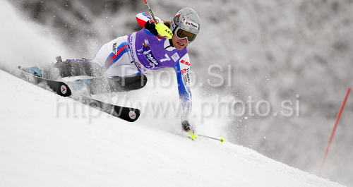 : Seventh after first run Julien Lizeroux of France skiing in first run of Men slalom race of Audi FIS alpine skiing World Cup in Kranjska Gora, Slovenia. Slalom race of Men Audi FIS Alpine skiing World Cup 2009-10, was held on Sunday in Kranjska Gora, Slovenia, on 31st of January 2010.