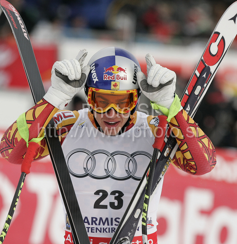: Third placed Erik Guay of Canada reacts in finish of Men downhill race of Audi FIS alpine skiing World Cup in Garmisch-Partenkirchen, Germany. Training for downhill race of Men Audi FIS Alpine skiing World Cup 2009-10, was held on Tuesday in Garmisch-Partenkirchen, Germany, on 9th of March 2010.